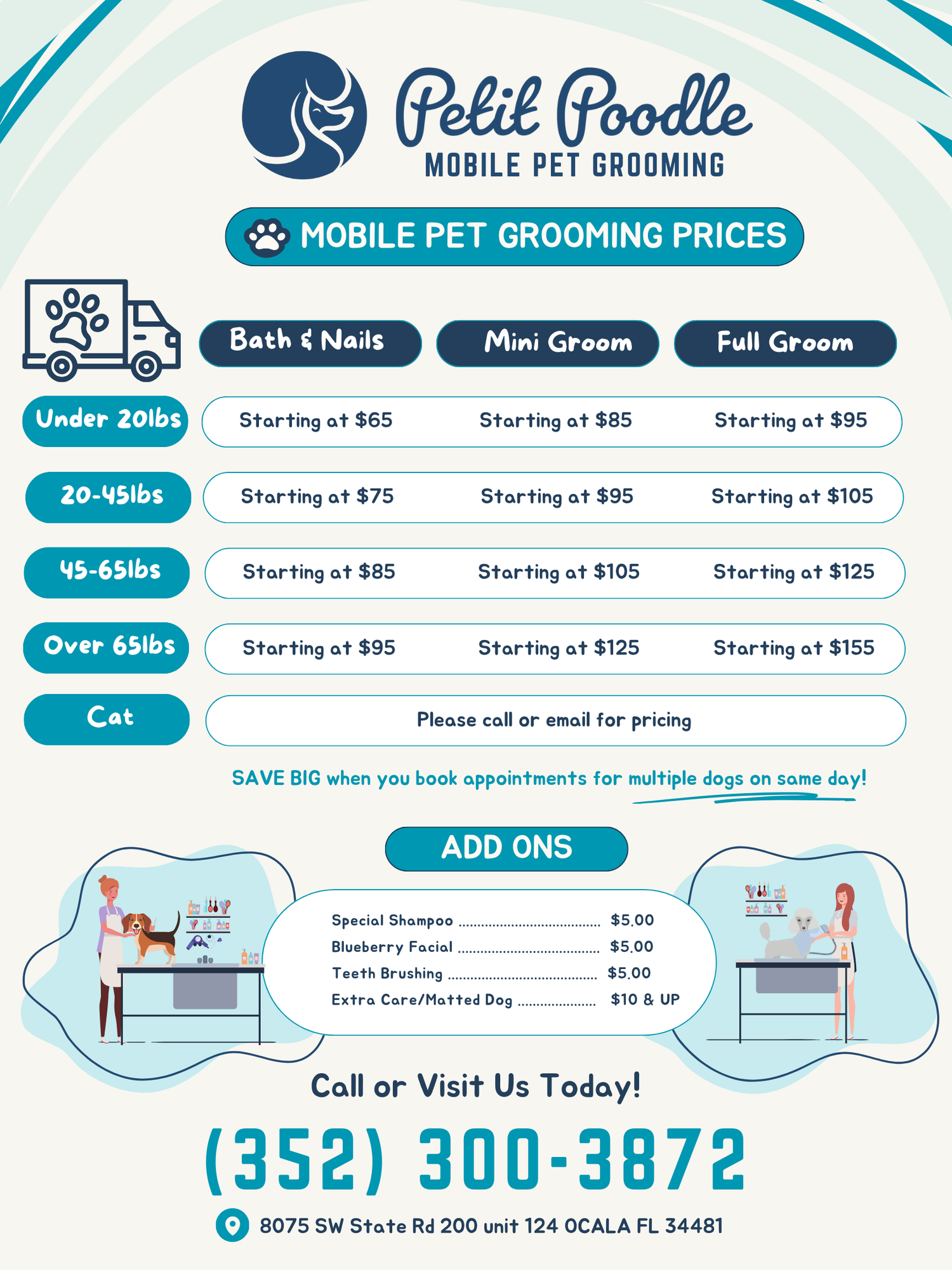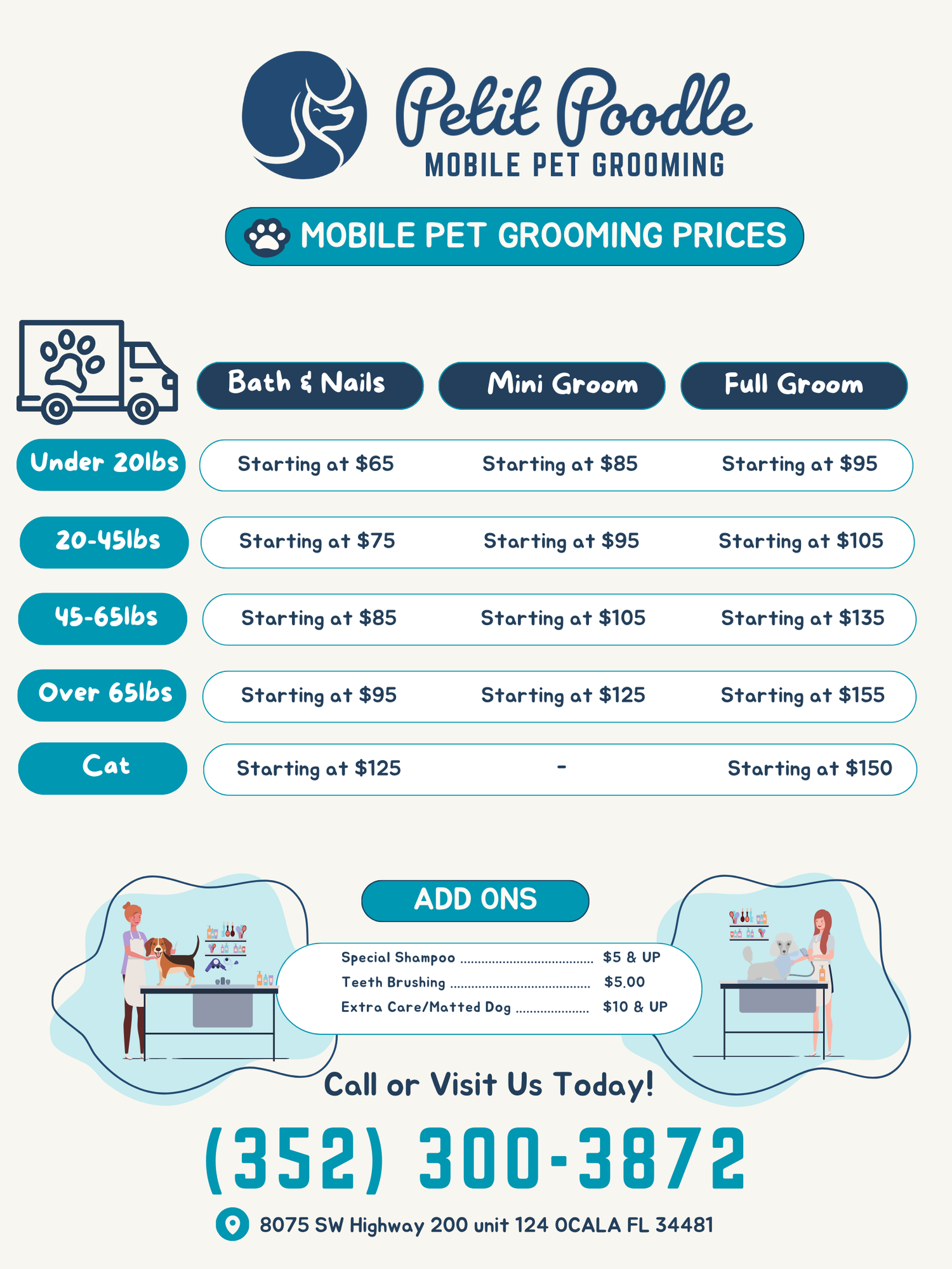 Experience top-tier grooming for your pets with Petit Poodle's mobile service! We bring expert care and pampering directly to your doorstep with our state-of-the-art grooming van. Enjoy the convenience of salon-quality treatments without the hassle. Contact us today for a stress-free grooming experience!